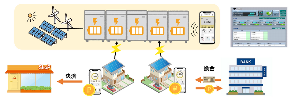 電気の発電量に紐づいてポイントが発行され、ポイント決済や国際送金、法定通貨への換金ができる電気通貨ポイント事業。国際金融としての価値を持つ資源である電気」の量に基づいた電気通貨ポイント経済圏の構築を目指します。